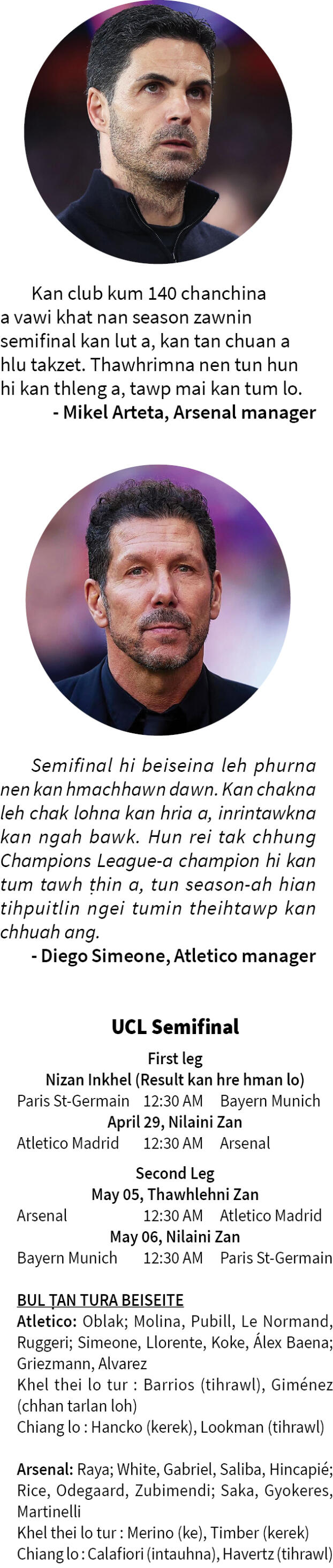 UCL semifinal-ah la champion ngai lo; Zanin dar 12:30-ah Atletico Vs Arsenal