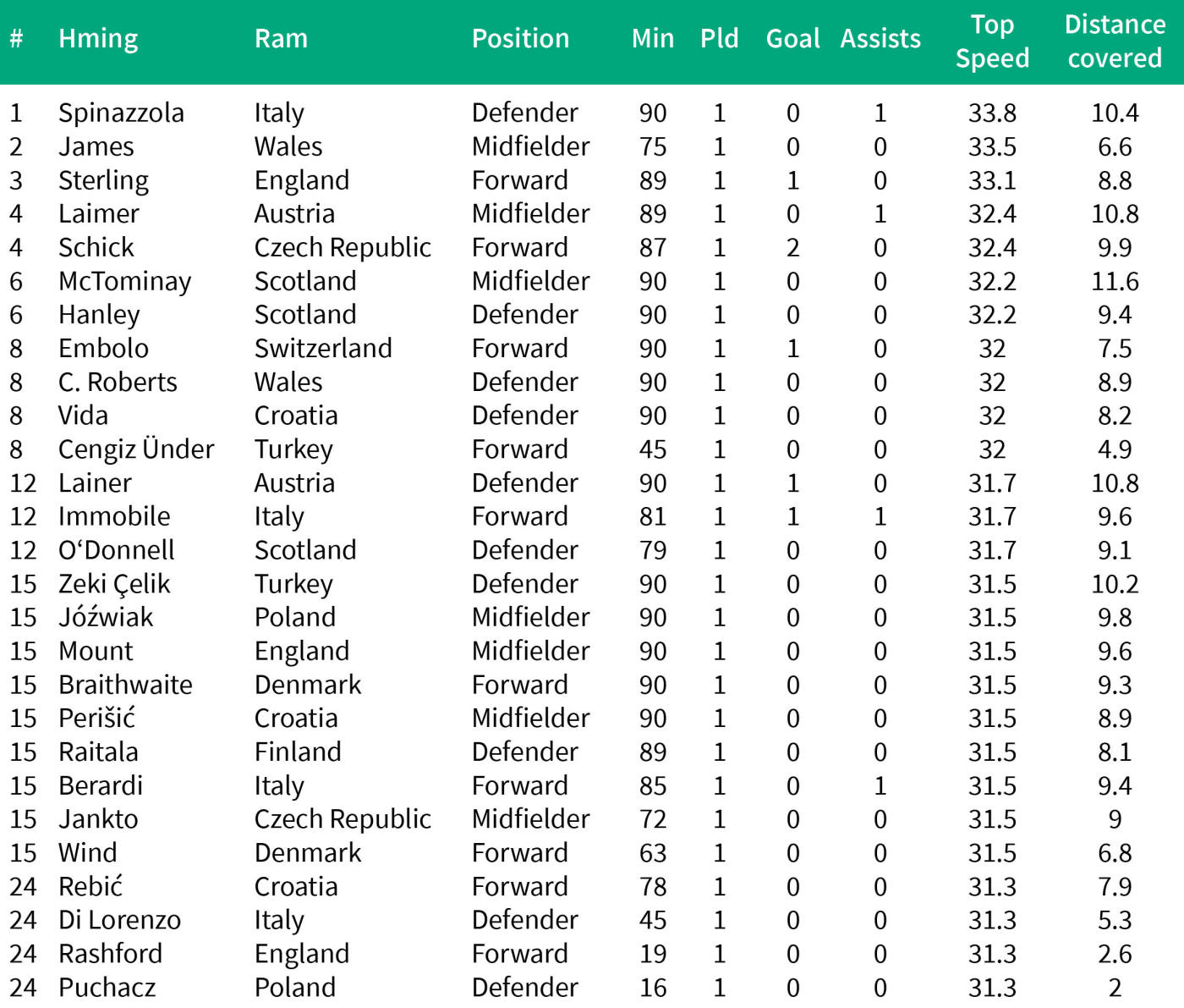 Spinazzola dawta tlan chak leh ber chu Wales winger Daniel James a ni a, Manchester United winger hian Switzerland nen an inkhelh ṭumin 33.5 km/hr-a tlan ṭum a nei a, Croatia laka England chakna goal khungtu Raheem Sterling pawhin a tlan chak lai berin 33.1 km/hr a hawlh bawk.