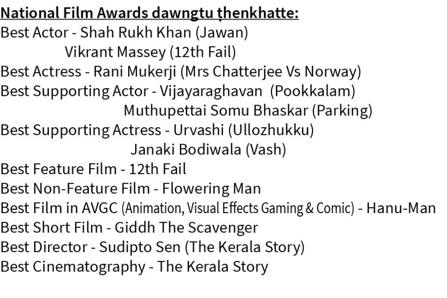 India sorkarin film industry huanga che ṭha leh hlawhtlingte chawimawina atana kumtin a buatsaih ṭhin, National Film Awards vawi 71-na award dawngtute chu Zirtawpni zan khan puan a ni. Shah Rukh Khan chuan 'Jawan' film hmangin Best Actor award dawng tura thlan a ni. Film industry-a kum 33 zet a awm tawh hnua National Film Award a dawnna hmasa ber a ni.