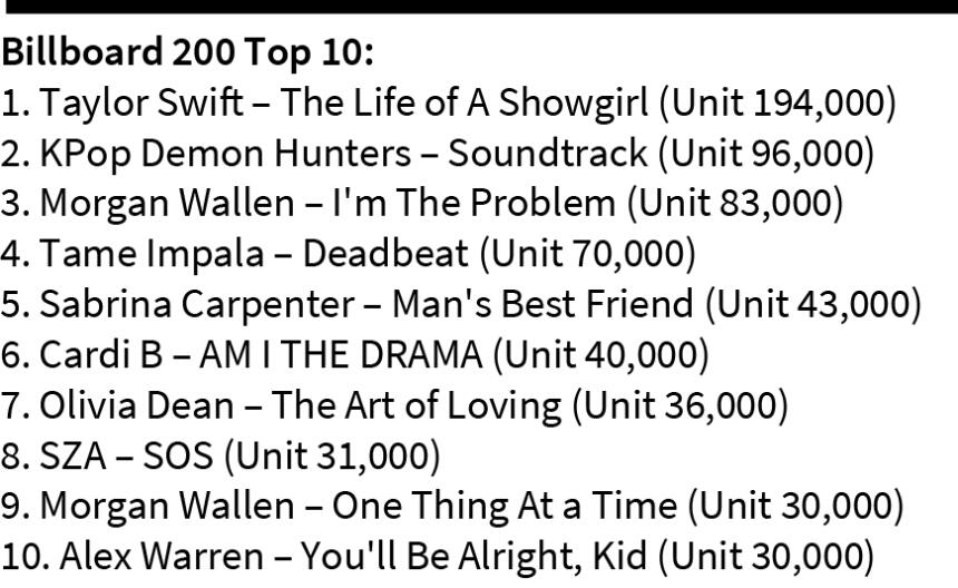 'The Life of A Showgirl' hian on-demand official stream 200.68 a nei a, album hi copy 38,000 hralh chhuah a ni tawh. KPop Demon Hunters 'Soundtrack' chuan equivalent album unit 96,000 neiin No 2-ah a la lang zel a, Morgan Wallen 'I'm The Problem' chuan equivalent album unit 83,000 neiin a dinhmun ngai pathumnaah a la awm bawk.
