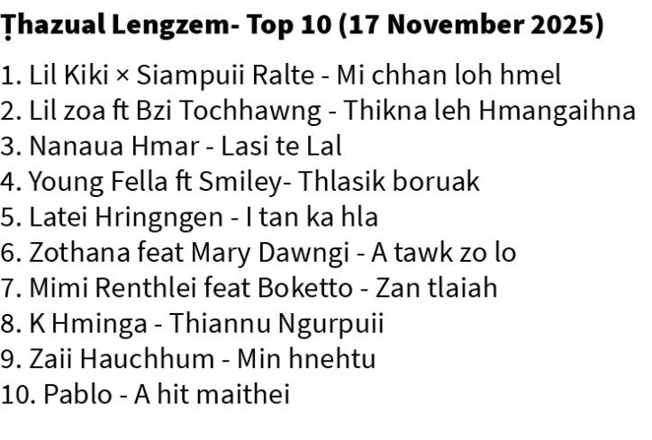 GIG Motors Ṭhazual Lengzem chart tharah, chart hmasaa pahnihna Lil Kiki x Siampuii Ralte 'Mi chhan loh hmel' chu No.1 ah a kaisang.