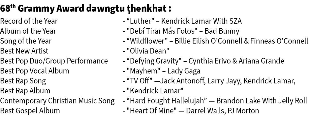 Rimawi huanga chawimawina ngaihhlut, Grammy Awards vawi 68-na chu Pathianni zan khan Crypto.com Arena, Los Angeles-ah host Travor Noah kaihhruaina hnuaiah hlawhtling taka neih a ni. Kumin Grammy-ah hian Kendrick Lamar che ṭha berin nomination pakua a hmuh aṭangin award panga a hum haw a, record thar a siam nghal.