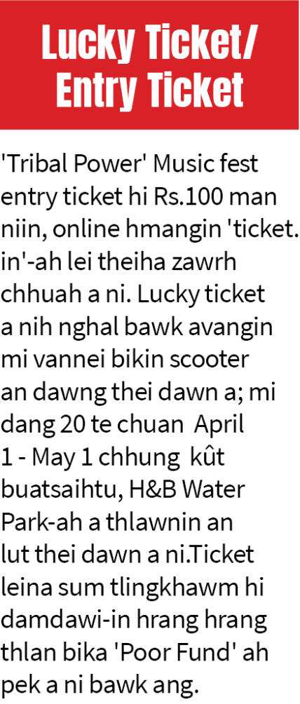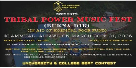 H&B Water Park bul tumin 'Tribal Power Music Fest (Bukna Dik)' chu Lammual-ah March ni 20 & 21, 2026 hian neih a ni dawn. University & College Beat Contest buatsaih a nih bakah Mizorama band ṭha leh zaithiam lar ten concert pui tak an nei bawk ang.