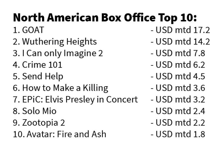 North American Box Office chart tharah Sony Pictures Animation leh Warner Bros. thawh dunna "GOAT" chu No.1-ah a kaisang ta. GOAT-ah hian NBA star Stephen Cury chuan animation-a a changtu ber Will-a aw a thawh a, naupang leh puitling tan pawha en theih tura duan a nih angin box office lamah a che ṭha zui hle.