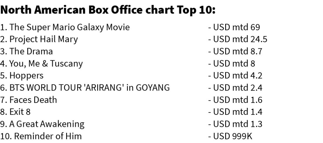 Universal animated sequel "The Super Mario Galaxy Movie" chu North American box office-ah a kar hnihna atan No.1 a ni chhunzawm a, nekchhuak thei an la awm lo.