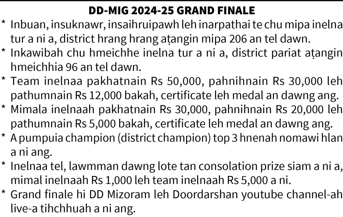 March 19-21, 2025 chhungin Chaltlang Field-ah Doordarshan Mizoram Indigenous Games (DD-MIG) 2024-25 hmawrbàwkna (grand finale) leh Cultural Festival buatsaih a ni dawn a; district 11 aṭangin infiammi 302-te Mizo infiamna chi nga hmangin an intihsiak dawn.