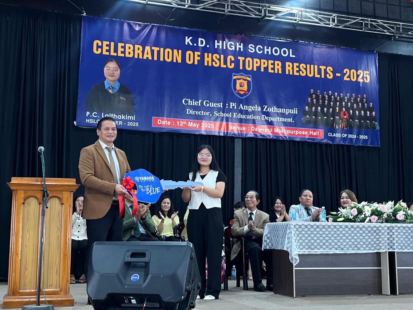KD High School chuan an sikulin HSLC 2025-ah result an neih ṭhat avangin nimin khan Dawrpui Multipurpose Centre-ah an lawm a; an zirlai PC Lalṭhakimi, HSLC 2025-a pakhatna hnenah principal Biakhmingliana Pachuau-in lawmpuina atan scooter leh pawisa a hlan a, zirlai dangte hnenah pawisa leh thilpek dang an hlan bawk.