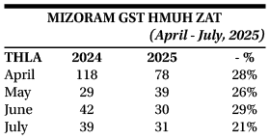 GST Council-in chhiah hmuh zat August 1, 2025-a a tarlan danin, Mizoram sorkar chuan July 2025-ah GST cheng vbc. 31 a hmu a, nikum July 2024-a a hmuh zat vbc. 39 aiin a hniam zawk a, a hniam zawkna hi 21% a ni.