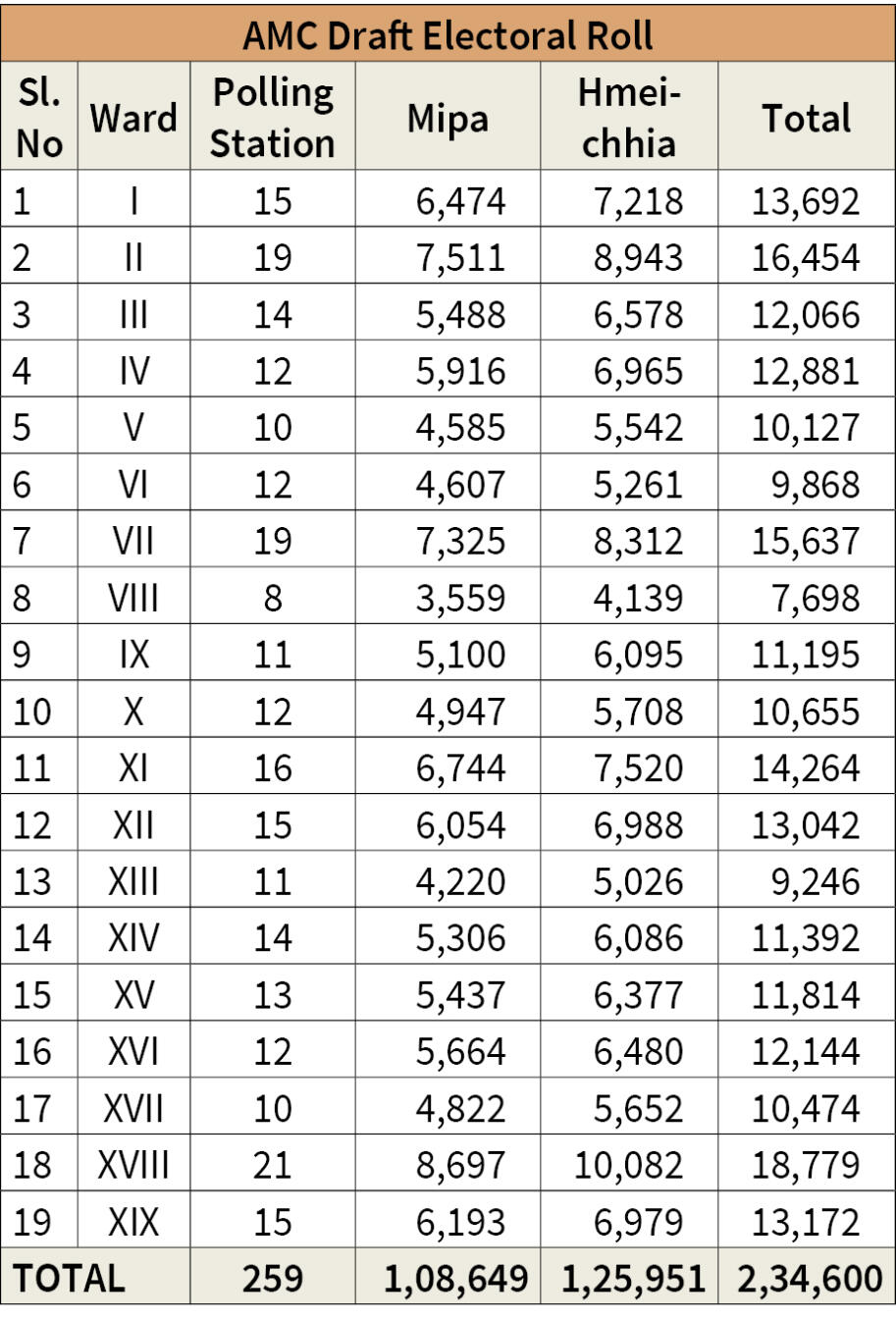 AMC draft electoral roll hi MLA e-roll 2022 behchhana siam a ni a; siamṭhat, insawn, paih ngai leh inthun thar duh tan October 25, 2025 thleng Local Level Officer hnenah dilna thehluh theih a ni. Final roll chu January 7, 2026-ah tlangzarh tura ruahman a ni. AMC final electoral roll hi MLA electoral roll atan rin nghal theih a ni lo.
