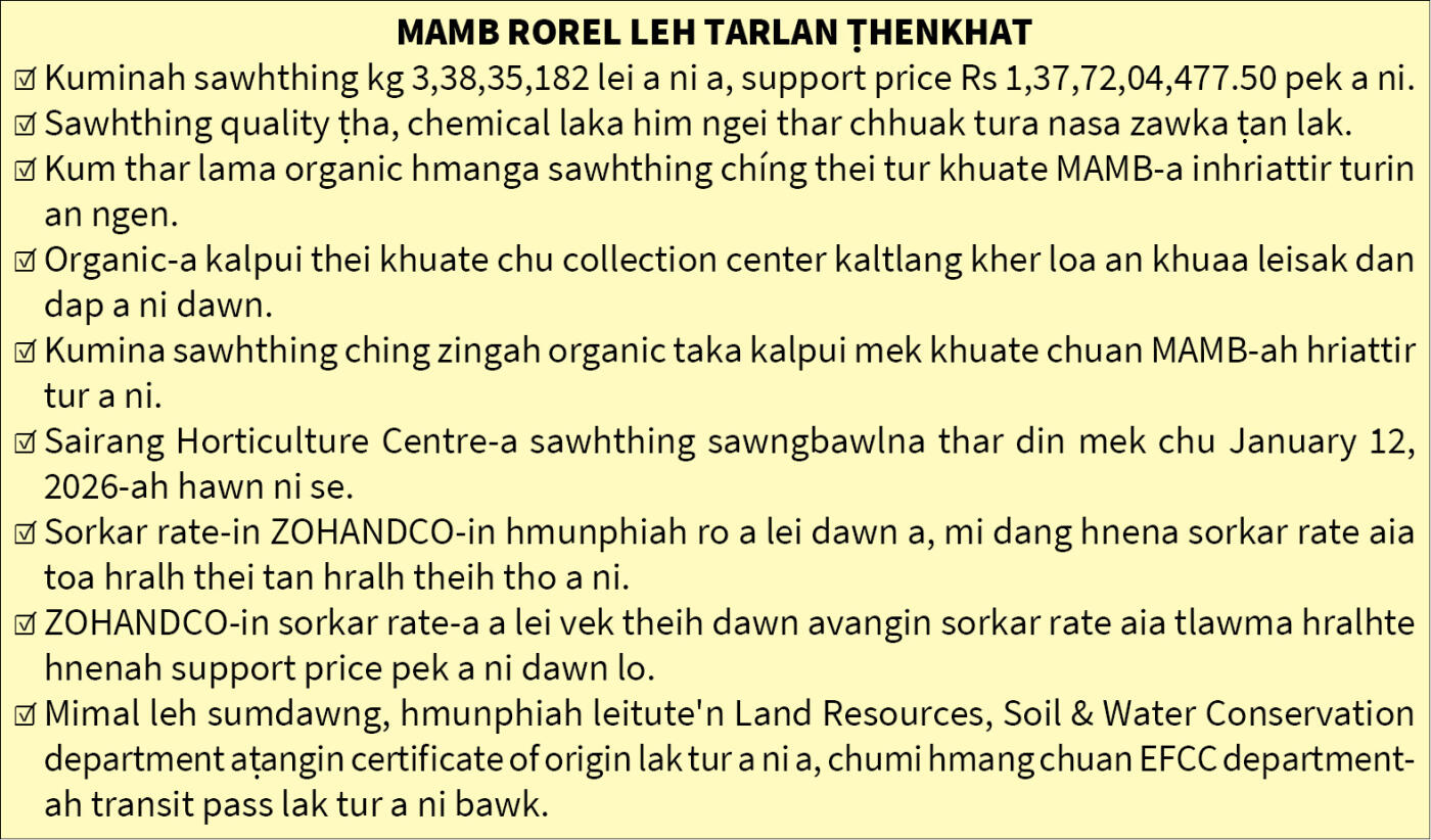 Mizoram sorkar chuan February 2, 2026 aṭangin sawhthing a lei ṭan leh dawn a, hmunphiah chu February leh March 2026 chhunga lei tum niin, aieng leh Mizo hmarcha chu February - April, 2026 chhunga lei a ni ang. Buhhûm erawh chu kumin November thla khan lei ṭan a ni tawh.