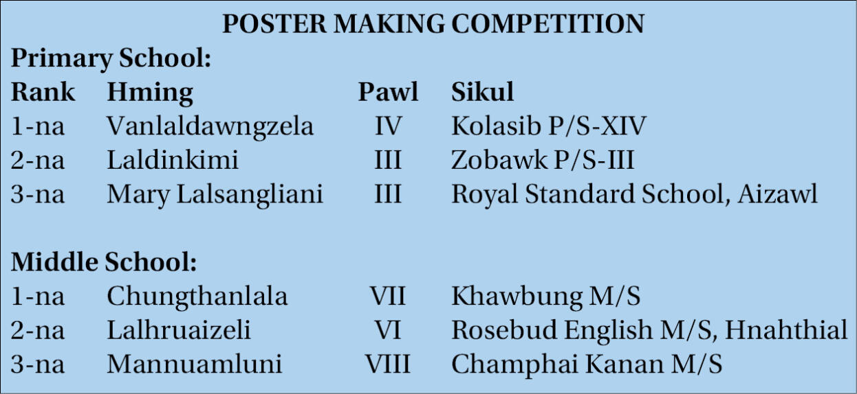 Intihsiakah hian proimary school leh middle school zirlai tan Online Poster Making Competition buatsaih niin, thupui chu 'Stop Pollution, Save Earth' tih leh, 'Pollution: The Silent Killer' tih a ni a; primary level-ah zirlai 107 telin, middle level-ah zirlai 101 an tel.