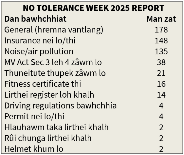 Home department chuan Krismas inbuatsaih vanglaia lirthei veivâk tibahlah thei zawnga No Tolerance Week puan ṭul an ti tawh lo a, police-te chu ngawrh lehzuala an hna thawk (duty) tura tih an ni thung. December 1-5, 2025 inkara No Tolerance Week hman chhungin lirthei 474 man a ni a, a hmuna pawisa chawitir zat chu Rs 8,65,000 a ni.