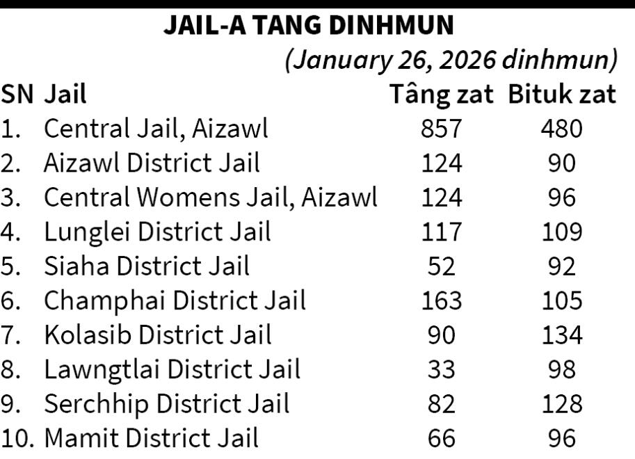 Mizoramah jail 11 a awm mek a, jail ṭhenkhatah chuan jail-a leng tura bituk aia tam daih an tàn laiin, ṭhenkhatah chuan jail-a leng tura bituk aia tlem daih an táng. Saitual District Jail-ah táng dah a la ni lo.
