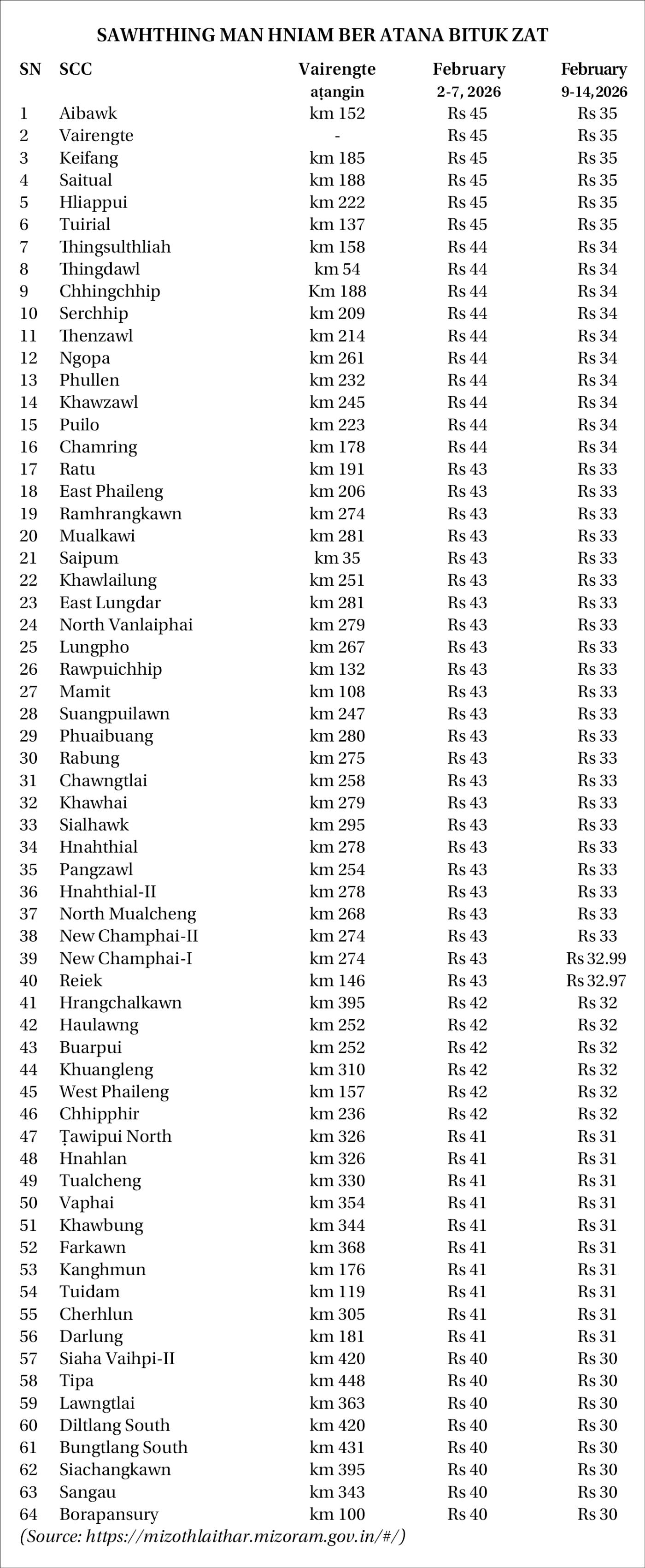 Mizoram Agricultural Marketing Board (MAMB) chuan tun kar chhung atan sumdawngte'n Mizorama sawhthing thar an leina man hniam ber tur a bituk thar a, kg-ah Rs 30-35 inkar a ni. Sorkara hralh tuma Myanmar aṭanga sawhthing la lut an awm nia hriat a ni a, thil dik lo hmanga sum lak luh tum lo turin sorkar chuan mi tin a ngen.