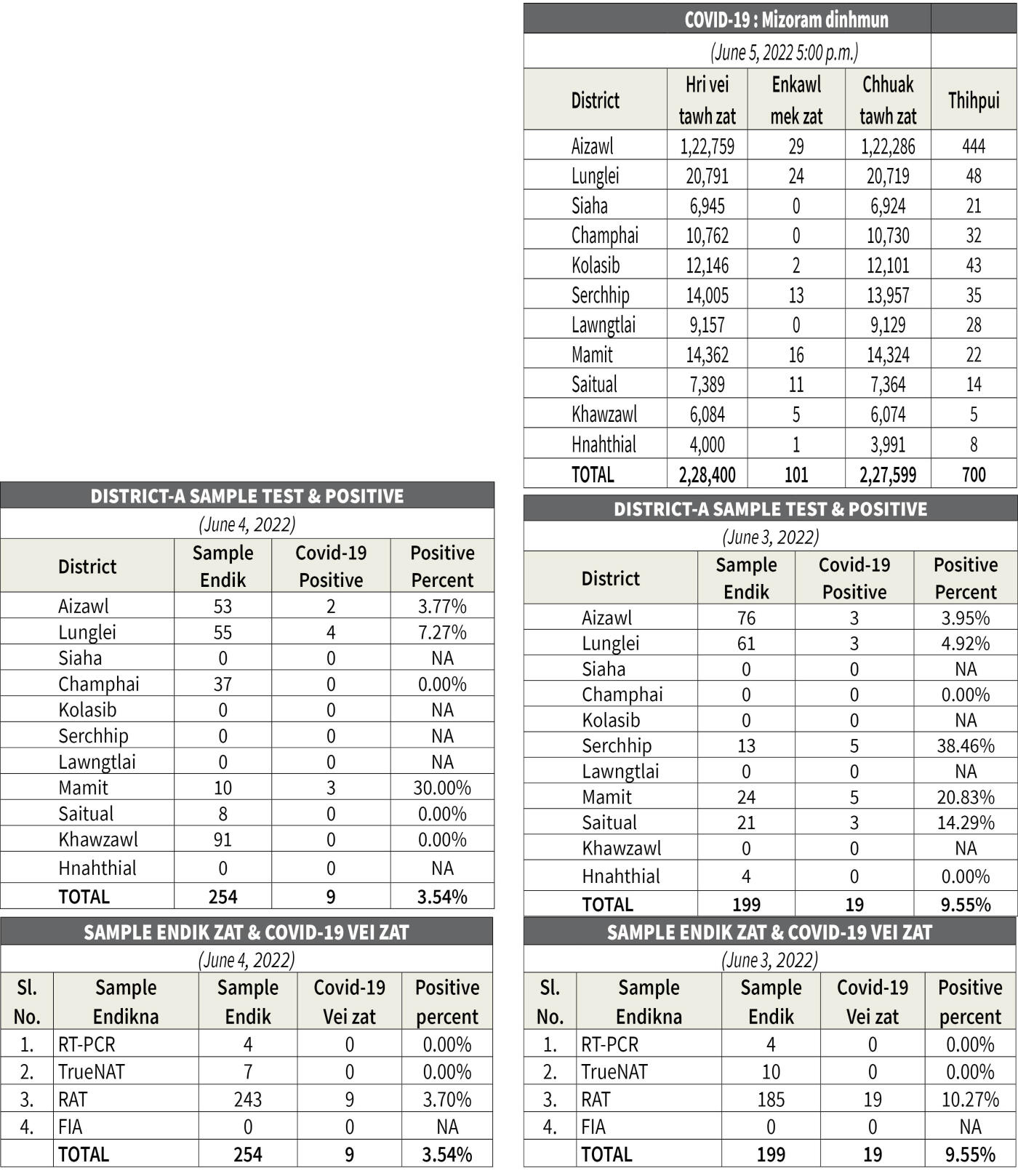 June 3, Zirtawpnia Covid-19 positive hmuh chhuahte chu mipa 11 leh hmeichhia pariat an ni a; Rapid Antigen Test hmanga hmuh chhuah vek niin, positivity rate 9.55% a ni. Inrinnia Covid-19 vei hmuh tharte chu mipa pali leh hmeichhia panga an ni a; RAT hmuh chhuah vek niin, positivity rate 3.54% chiah a ni.