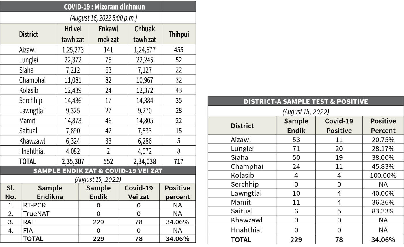 August 15, Thawhṭanni khan Mizoramah Covid-19 vei mi 78 hmuh chhuah a ni a, August thla chhungin mi 2,507 hmuh chhuah a ni tawh. Nimin khan hripui vei dam tawh mi 169 chhuahtir an ni a, Covid-19 vanga thi an awm lo.