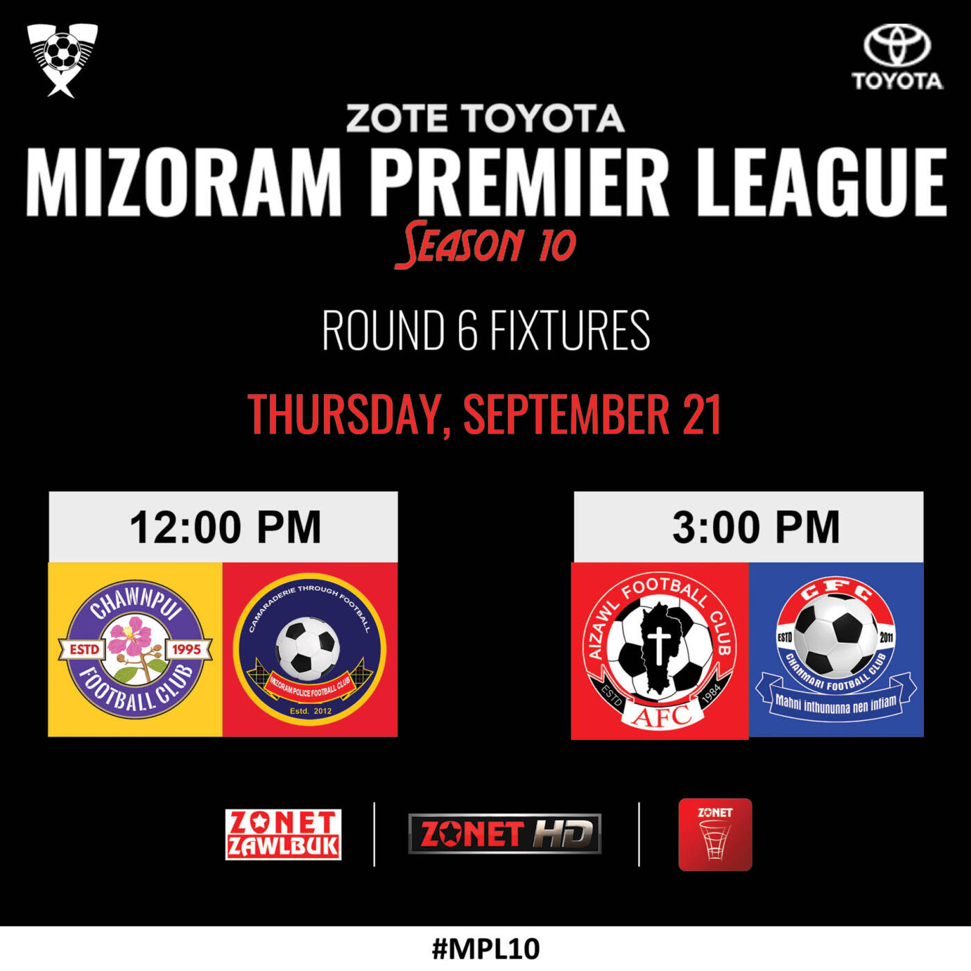 Aizawla Zote MPL10 en ziah ṭhin tan chuan Kolasib-in I League club Aizawl FC leh Chanmari FC inkhel tur an chang hi a thikawm hial ang. Chutihrualin MFA leh Zonet buatsaih Zote Toyota MPL10 hi Zonet Zawlbuk leh Empai kaltlangin a en theih.