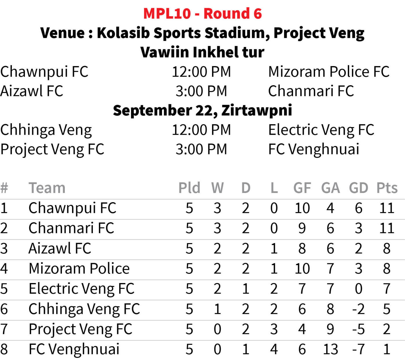 Chanmari FC-in Police lakah point khat chauh an hlawh chhuak a, an lawm lo. Niminah an khingpui tur Aizawl FC-in Kolasib an pan chauh laiin Chanmari erawhin September 18, Thawhṭanni khan inelna khelhna hmun tur hi an pan der tawh. Match khelhna tur hmun Kolasib Sports Stadium leh Saidan-ah training ṭha an nei tawh a, I League club hneh tumin an inbuatsaihna a ṭha hle.