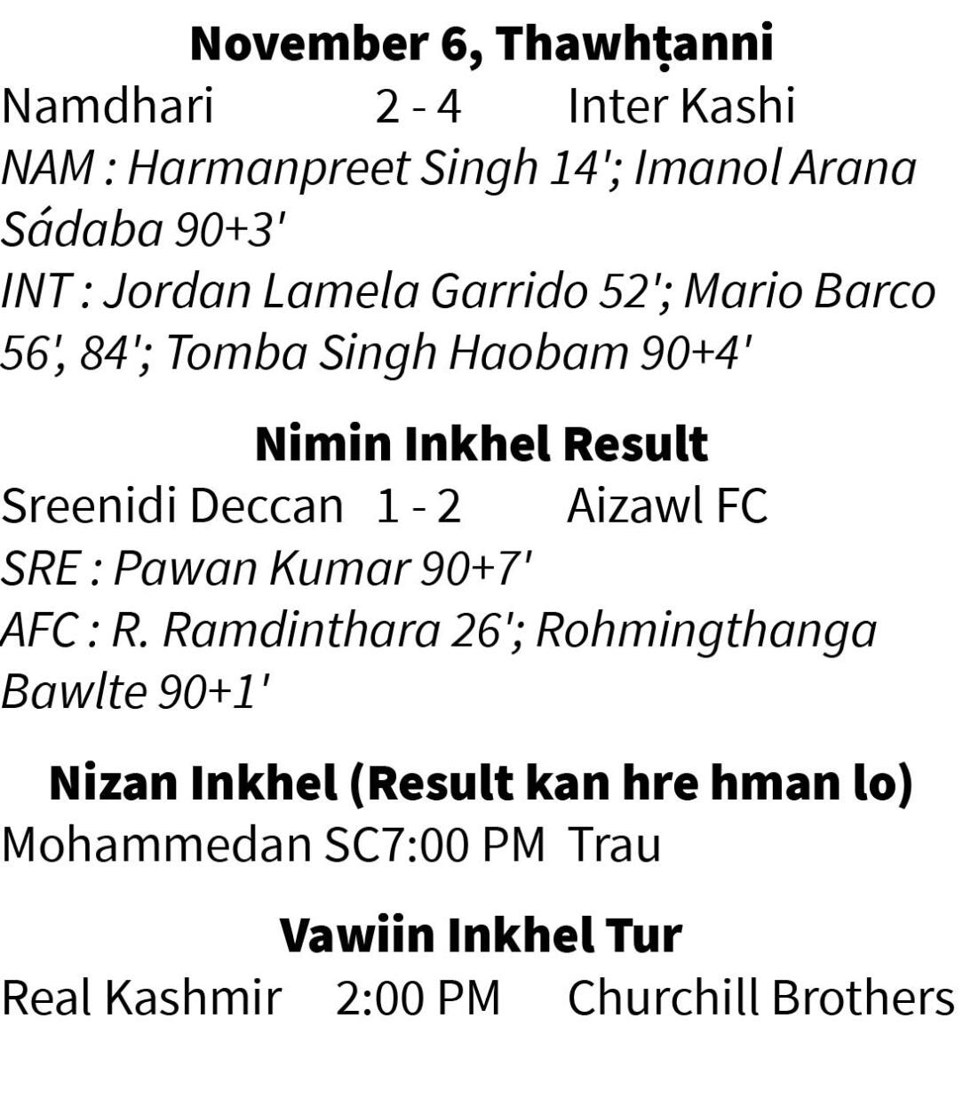 Sreenidi-in freekick hmang ṭangkaiin Pawan Kumar hmangin siphurh an sut ṭhen a, nuam sain Aizawl FC an chak lo - thawhrimna leh inpekna zawng zawng nen an chak. Injury time minute 12 zet an khelh zawhah referee-in huntawp hamrik a ham a, Aizawl FC 2-1 in an chak hram.