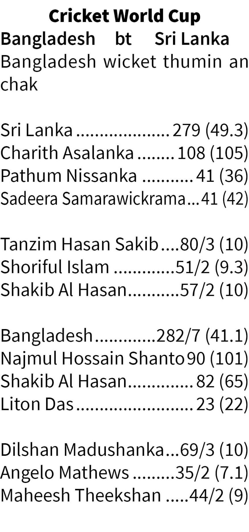 Cricket World Cup-ah Bangladesh-in November 6, Thawhlehni khan Sri Lanka chu wicket thumin an hneh. Bengal Tigers hian hnehna chang mah se semifinal luh beiseina an nei tawh lo a, Lions nen hian an tla fel.