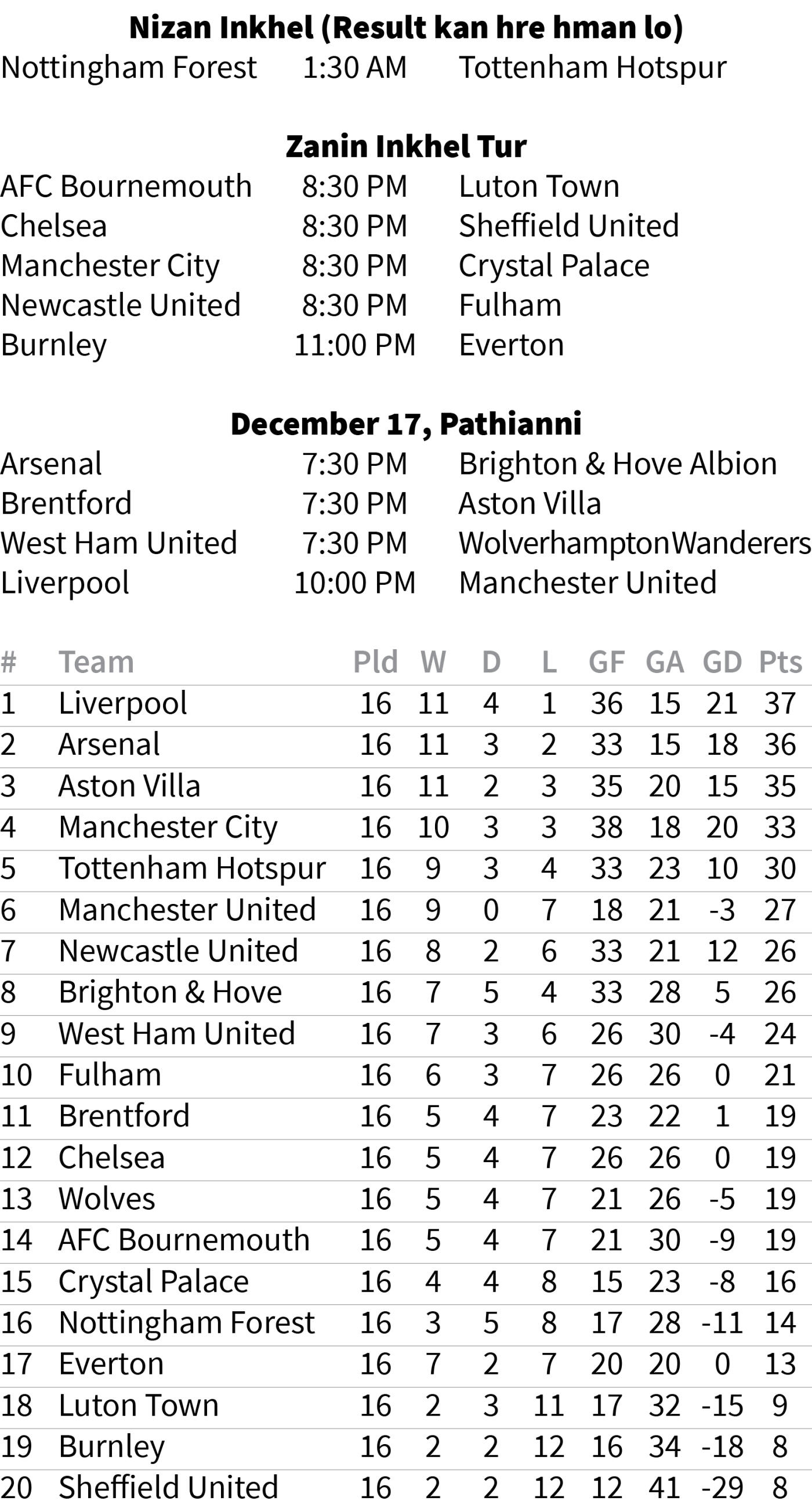 Zanin dar 7:30 hian Brighton an mikhual dawn a, an chak a nih chuan hmahruaitu an ni lailawk leh ang - Pathianni zana Liverpool leh Manchester United inkhel result a zirin an dinhmun erawh a la danglam leh thei dawn a ni.