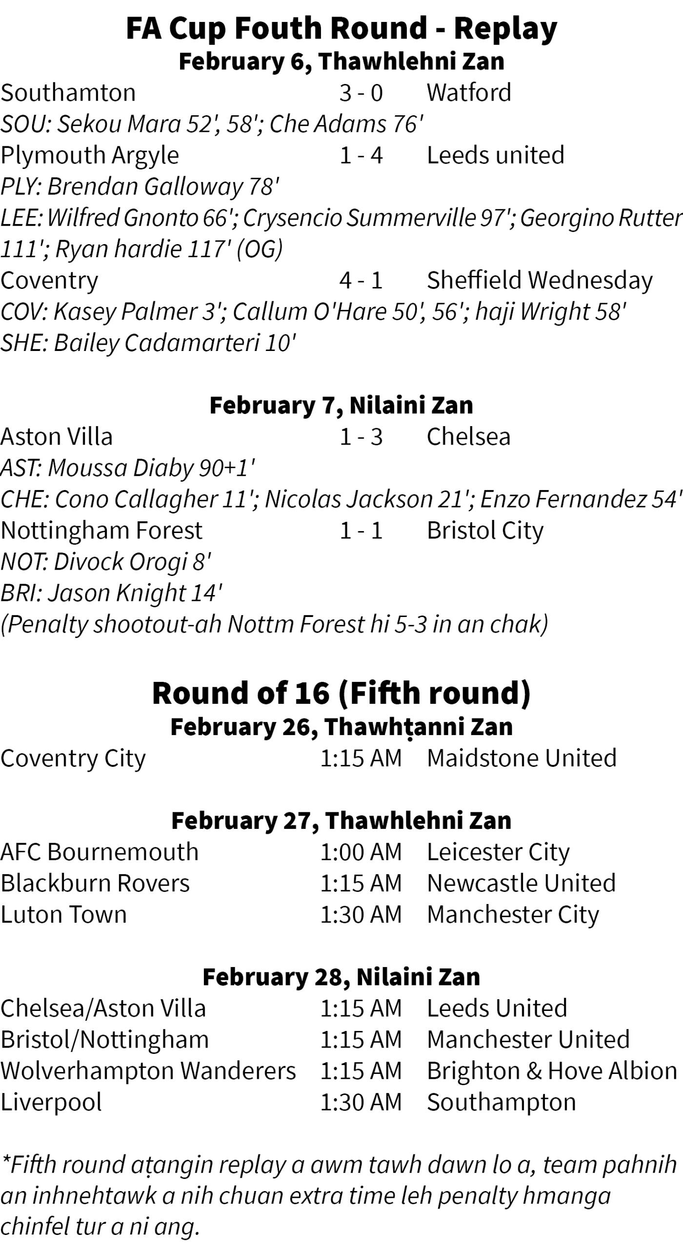 Nilaini zan FA Cup fourth round replay inkhel dangah - Chelsea bakah Nottingham Forest an tlang bawk a, Thawhlehni zan khan Southampton, Coventry leh Leeds United te an tlang tawh bawk.