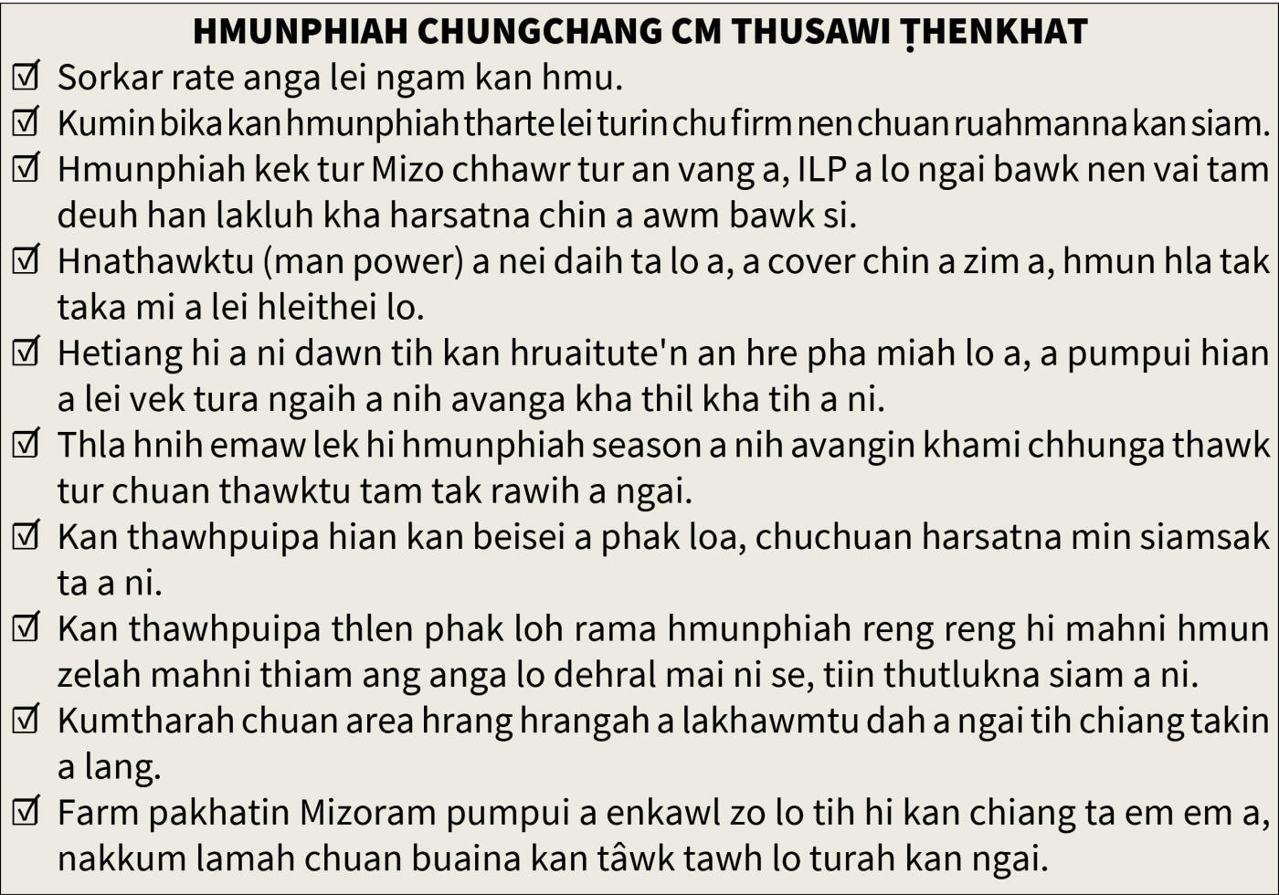 Chief minister Lalduhoma chuan sorkarin hmunphiah a hralhnaah Mizoram pum tuam turin harsatna an tawh mek thu leh sorkar kumtharah chuan buaina tawk tawh lo tura an inngaih thu a sawi a, "Hmunphiah thartute hriatthiamna kan ngen mawlh mawlh a ni," a ti.. Hetihlai hian MNF chuan thuchhuah siamin, an inzawrh ang ngeia hmunphiah lei turin Mizoram sorkar an phût thung.
