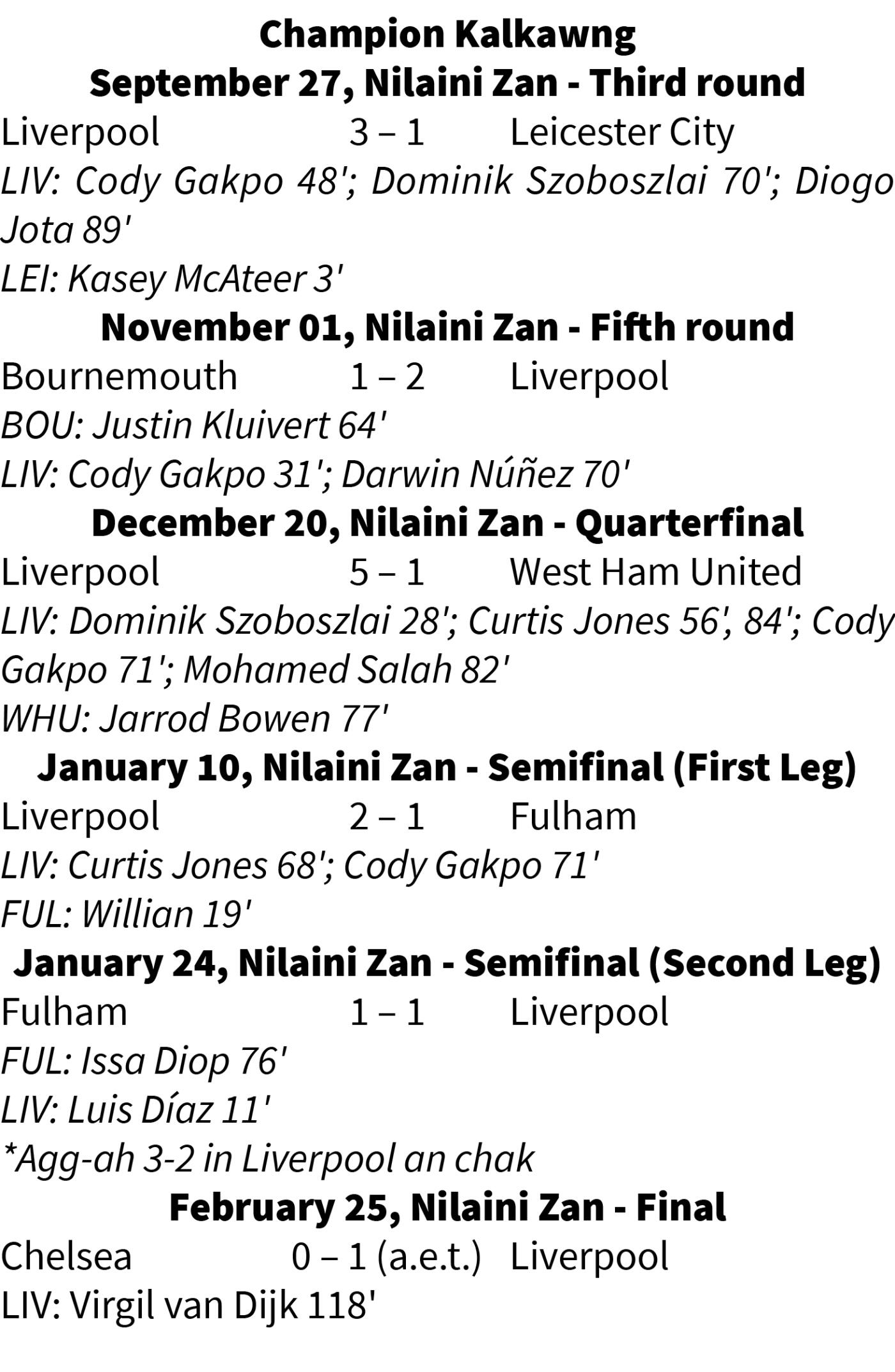 League Cup WINNERS , Premier League ? , Europa League ? , FA Cup ? : Chelsea ngamtu Liverpool-in nomawi an chawi