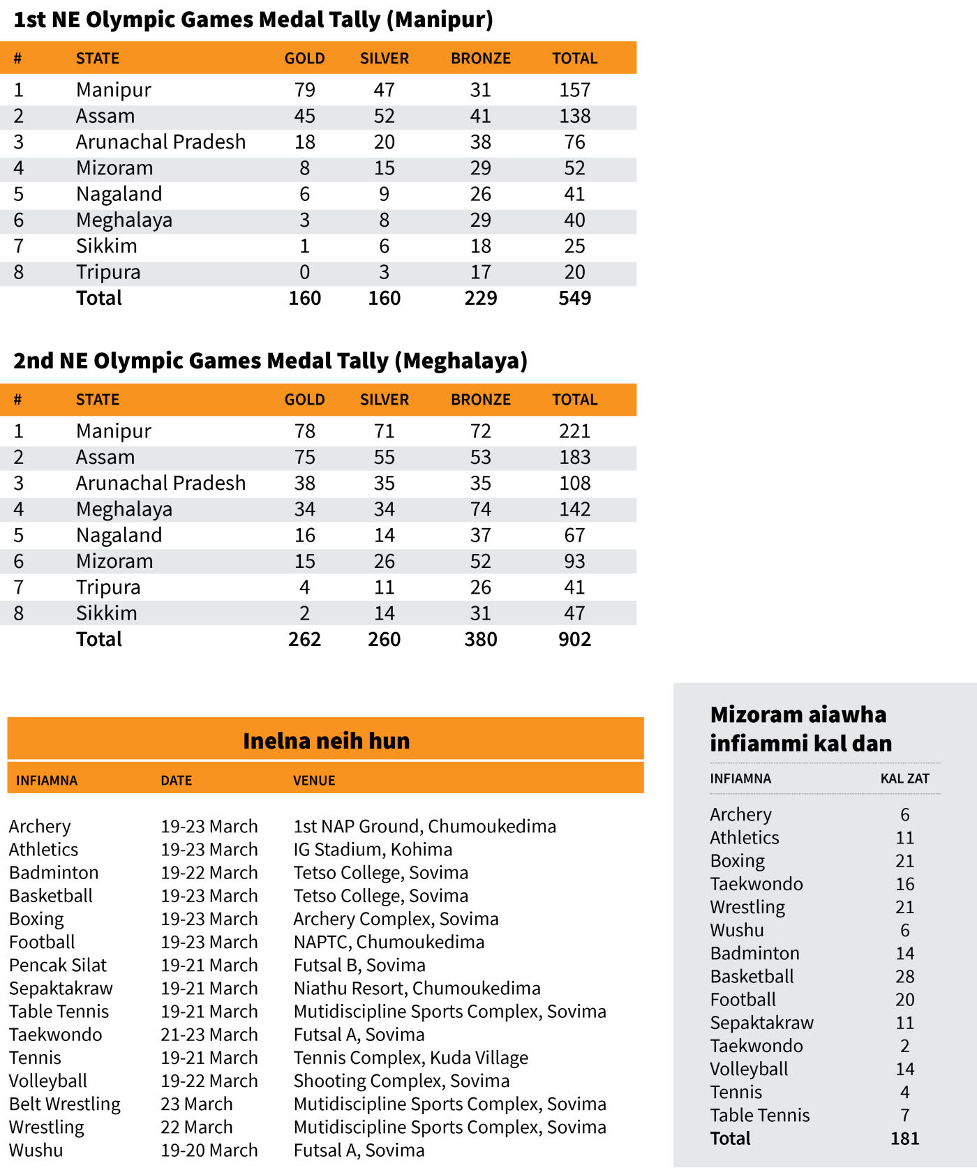 NE Olympic vawi hnihna chu Meghalaya-ah khelh a ni a; inelna neih hmasak ber ṭuma che ṭha Manipur (G-78), Assam (G-75), Arunachal Pradesh (G-38) te chu an indawt leh ṭhap. Inelna thlengtu Meghalaya-in nasa takin hma an sawn a, gold 34 an la. Mizoram erawhin gold 15 la mah se gold 16 latu Nagaland an tluk phak loh avangin paruknaah an awm.