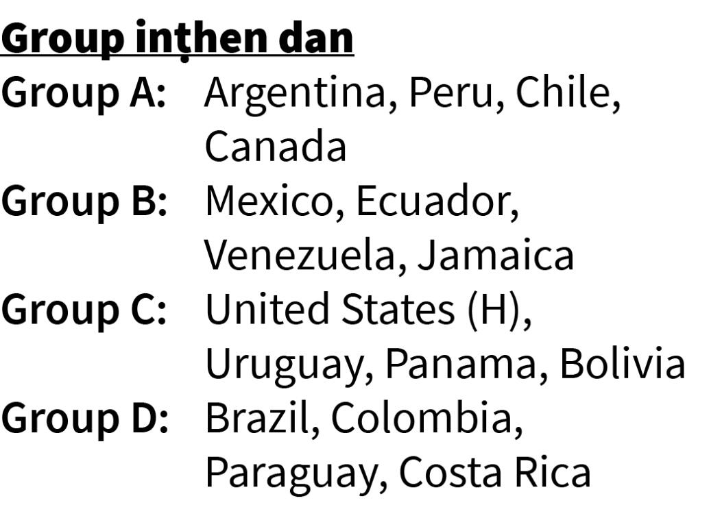 FIFA World Cup champion Argentina chu group A-ah an awm a, Lionel Messi leh Angel di Maria te chu squad-a a awm chiang tura sawi an ni. Group B-ah CONCACAF Gold Cup champion Mexico an awm a, group C-ah CONCACAF Nations League champion United States an awm. FIFA World Cup-a record nei ṭha ber Brazil chu group D-ah an awm thung.