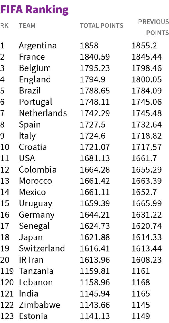 India hnuai chiahah hian Zimbabwe an awm a, anni hi 122-na niin, hmun hnihin hma an sawn thung a, Blue Tigers chung chiahah hmun nga ngawta tlahniam Lebanon an awm - a pumpuiah Argentina chu pakhatna an la ni a, England chu pathumna aṭangin palinaah tlain, Belgium chu palina aṭangin pathumnaah an chho thung.