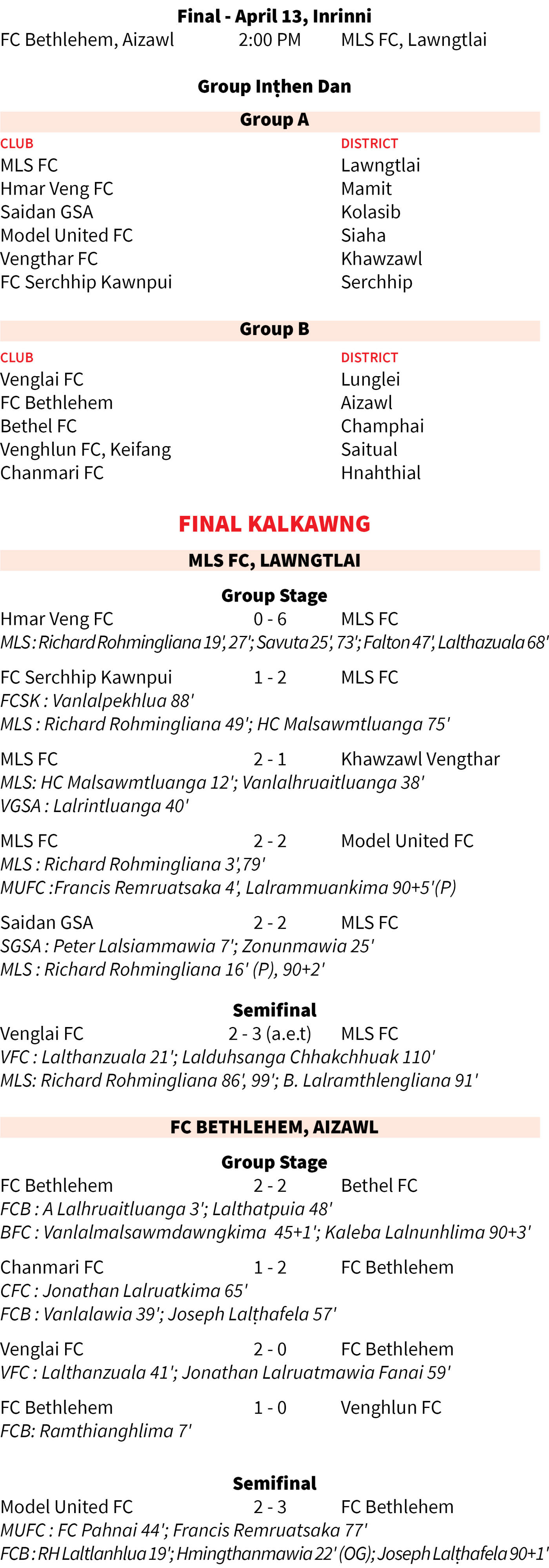 MLS FC hi group A-ah pahnihna ni mah se semifinal-ah group A pakhatna Lunglei club Venglai FC chu extra time-ah 3-2 in an hneh. Venglai FC hi group stage-ah FC Bethlehem hneh loh an ni. Chutihrualin FCB hi group B pahnihna ni mah se semifinal-ah Model United 3-2 in an hneh. Group stage-ah MLS leh Model United hi 2-2 in an inhnehtawk thung.