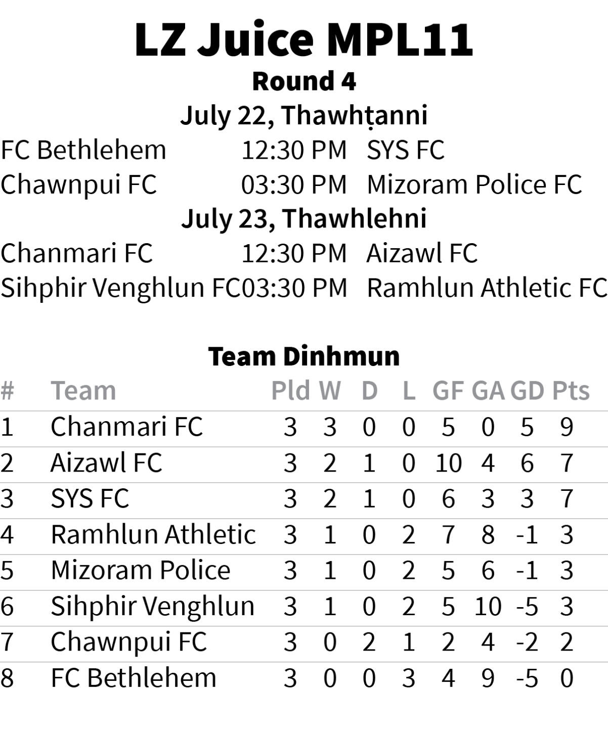 July 9, Thawhlehni aṭangni MPL11 khelh ṭan a ni a, round 5 khelh zawhah I Day Football khelh a nih dawn avangin MPL11 chawlh rih a ni dawn. Chumi awmzia chu MPL club-ten I Day Football hmain match hnih khelh tur an la nei tihna a ni.