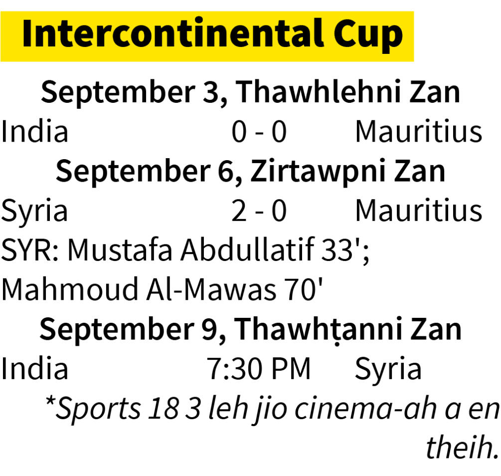 International break-ah India-in Intercontinental Cup an khel a, All India Football Federation buatsaih inelna hmachhawn tur hian sawm an nih angin Syria leh Mauritius an lo kal a, Blue Tigers-in beisei ang inkhel an la chhawp thei rih lo.