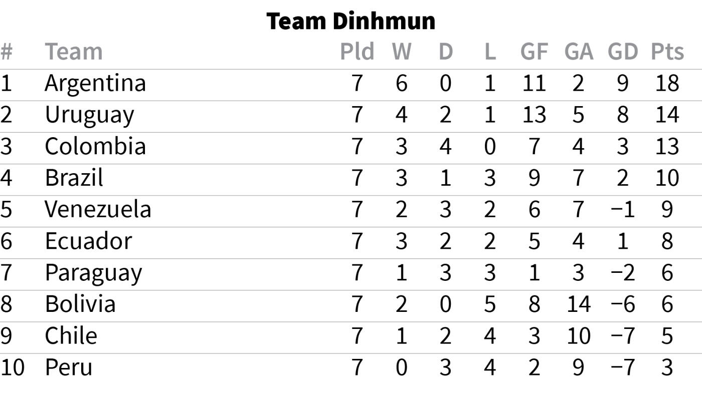 South American ram 10 ten World Cup qualifier match sarih ṭheuh an khel tawh - Brazil hian vawi thum hnehna changin point 10 an hmu tawh a, table-ah palina dinhmun an luah mek.