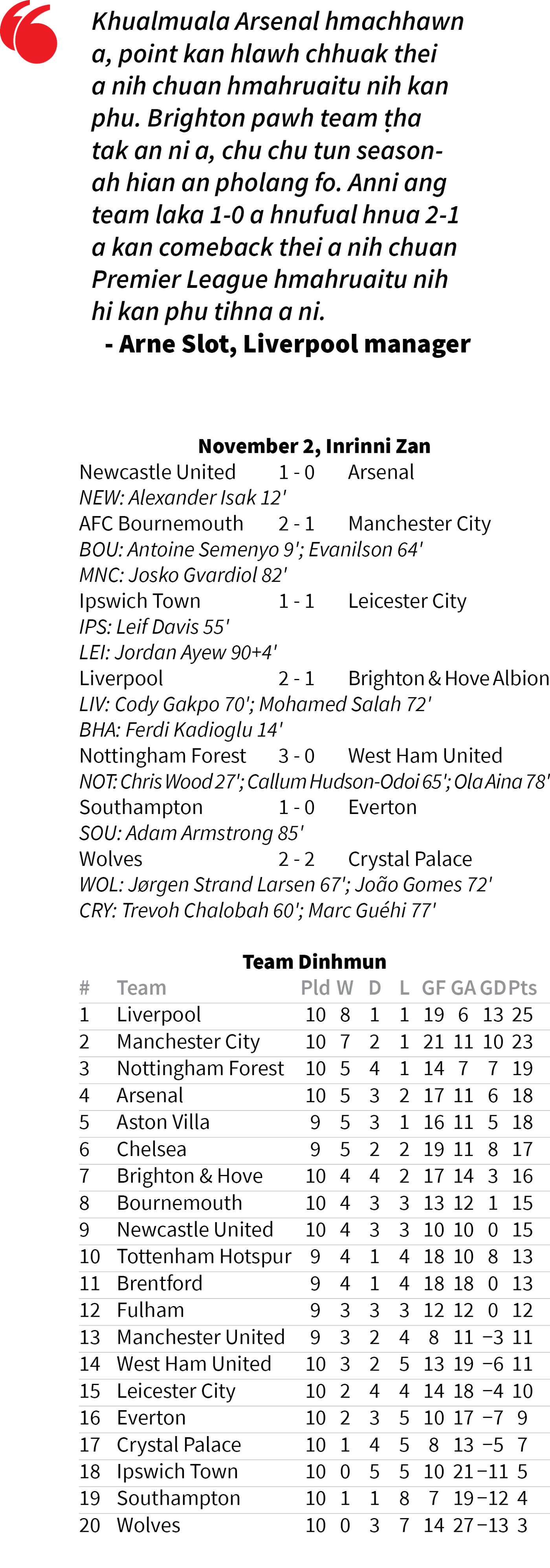 November 2, Inrinni zan kha Liverpool fan-te tan an duhthusam thlen zan a ni - champion tuma an elpui Arsenal leh Manchester City an tlawm a, anni an chak thung. Arne Slot-a naute hian table chung ber an luah leh ta.