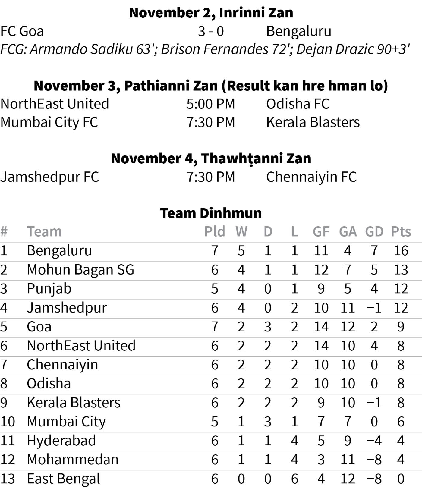 FC Goa tan Dinthar tlangval Ayush Chhetri chuan inkhel bul a ṭan a, Bengaluru lamah Lalremtluanga Fanai chuan tun season-a a vawi khat nan bul a ṭan bawk - league match sarih an khelh tawhah a la inlan kim vek.