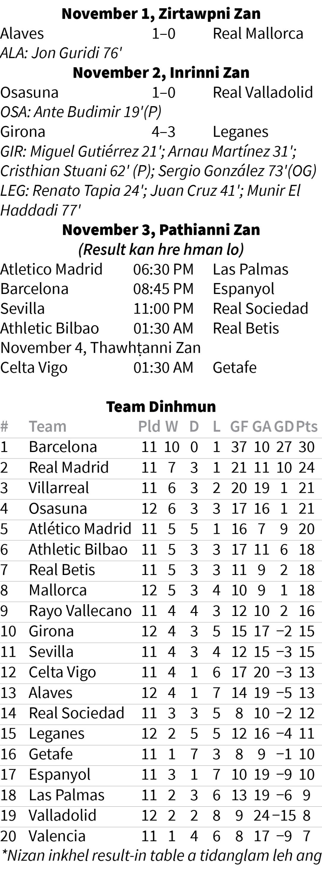Inrinni zan khan La Liga match hnih khelh niin, Zirtawpni zan khan match khat khelh a ni a, nizan khan match li a awm a, zaninah match khat khelh a ni ang.
