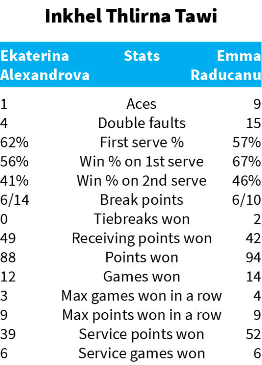 Melbourne Park-a inkhelah Raducanu hi seeded ni phak lo a ni, a khingpui Alexandrova erawh seeded 26-na a ni thung; inkhel inhnehtawk takah Britain nula hian 7-6 (7-4), 7-6 (7-2) in hnehna a chang.