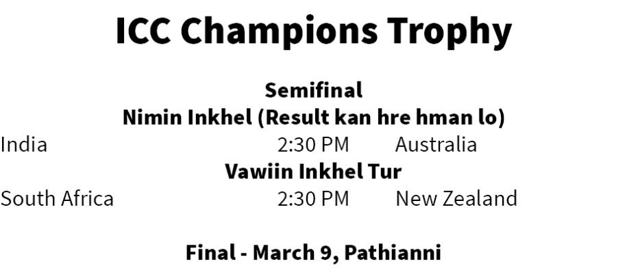 ICC Champions Trophy semifinal hnuhnung zawk chu vawiin tlai dar 2:30 hian South Africa leh New Zealand ten Gaddafi Stadium, Lahore-ah an khel dawn. Nimin khan India leh Australia ten semifinal hmasa zawk an khel a, result kan hre hman lo.