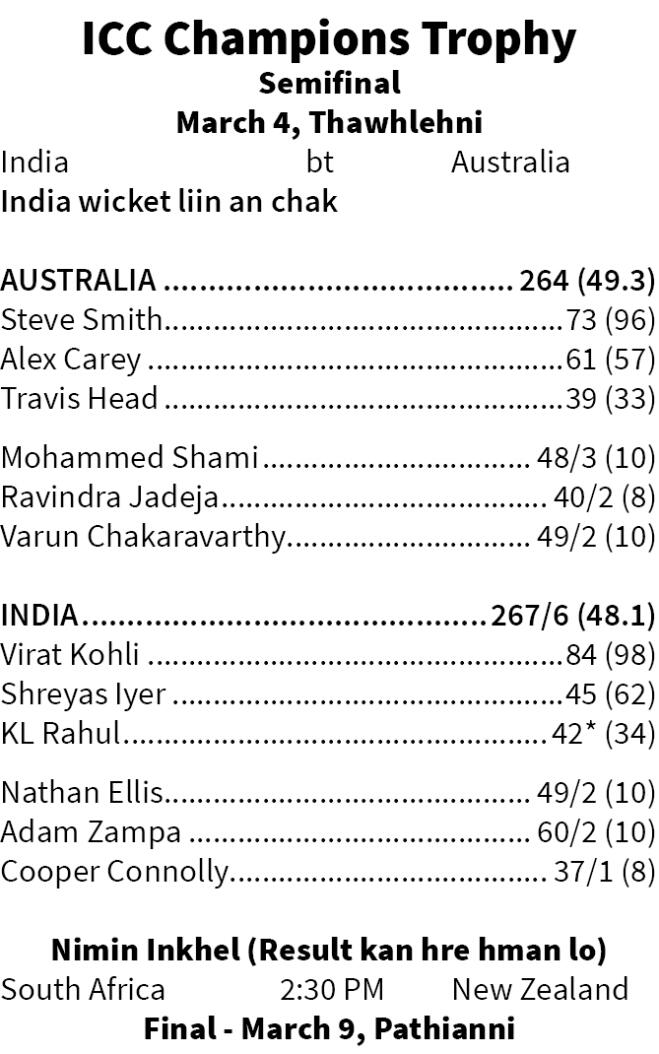 ICC Champions Trophy semifinal-ah India chuan Australia wicket liin an hneh a, final an lut. Thawhlehni zan khan Dubai-ah inkhel hmuhnawm chhawpchhuah a ni a, Virat Kohli-a'n 84 runs an siam a, Men in Blue-in Aussies target siam 265 chu over 48.1-naah an umpha.