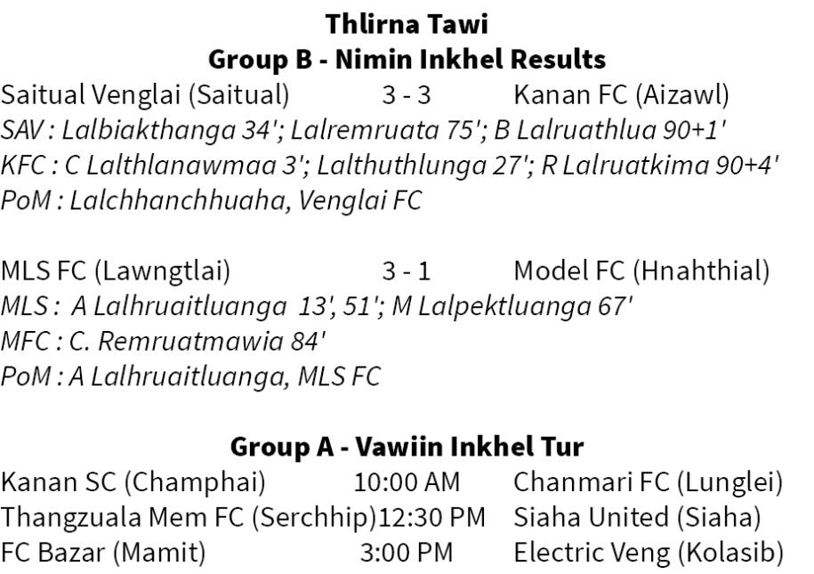 MFA Cup 2025-ah Saitual Venglaiin Aizawl DFA champion leh MPL khel tura inpettling Kanan FC te 3-3 in an inhnehtawk a, Aizawl club hi a suttu zawk an ni. Inkhel dangah MPL khel tur dang Lawngtlai club MLS FC-in Hnahthial club Model FC 3-1 in an hneh.