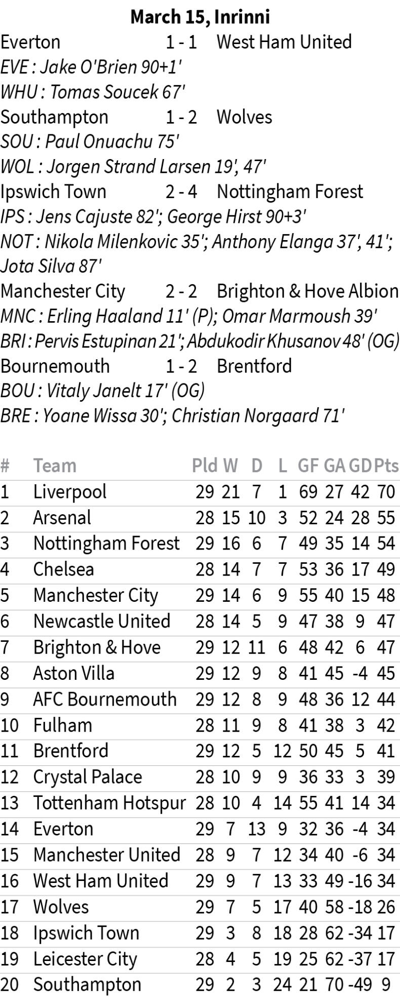 City forward Omar Marmoush-a'n minute 11-na lekah penalty a hlawh chhuak a, Erling Haaland-a'n goal-ah a chantir. Pep-a hoten goal khung hma mah se goal venhim an harsat. Minute 21-naah Pervis Estupinan-a'n freekick aṭangin siphurh a sut.