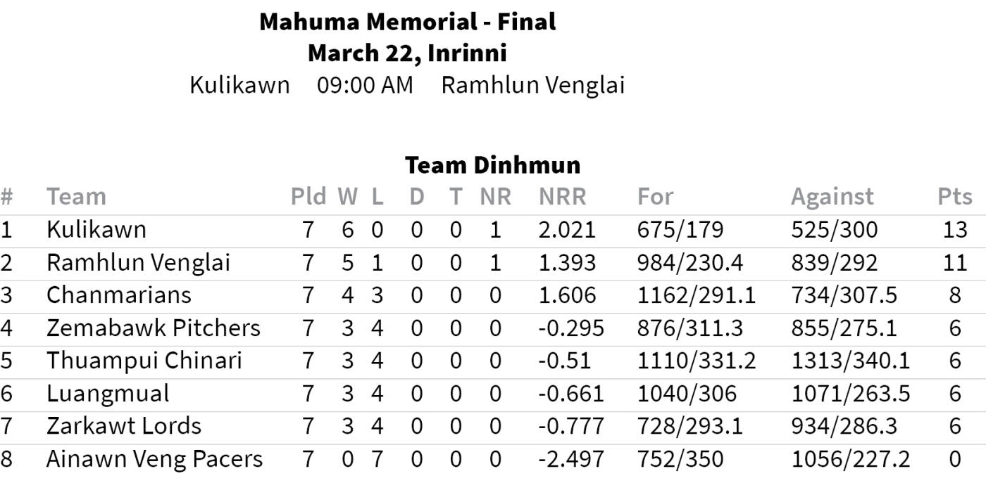 Cricket Association of Mizoram (CAM) hnuaia inelna - Mahuma Memorial 1st Division Screening Tournament 2025 chu vawiin hian a hmawr bawk a ni dawn, chawhma dar 9:00-ah Kulikawn leh Ramhlun Venglai ten nomawi an inchuh ang.