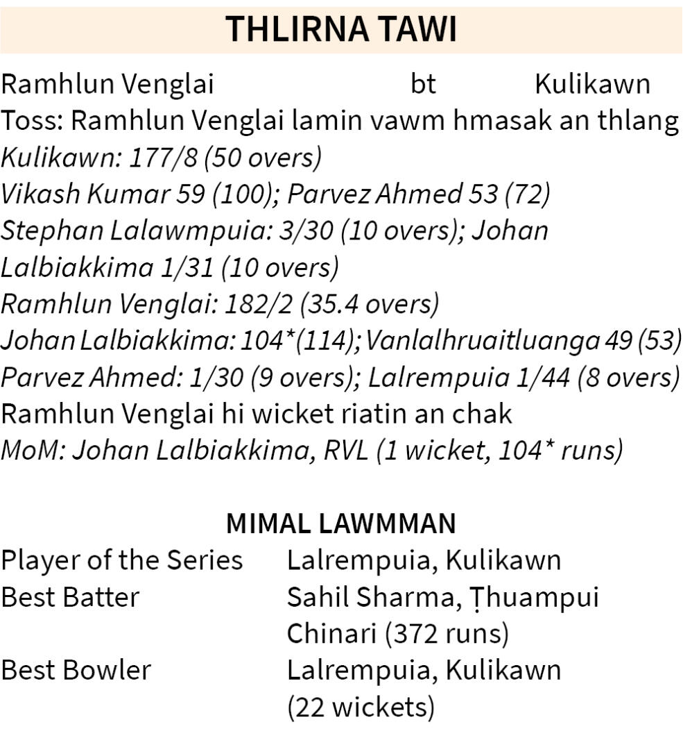 Tualchhung cricket chu Ramhlun Venglai ta a ni tih nemngheh nawn a ni leh ta. Mahuma Memorial 1st Division Screening Tournament 2025 khelh zawh takah RVL hian Kulikawn chu wicket riata hnehin an champion a, kum li chhunga vawi thum an champion na a ni - an ban theih china awm nomawi chu an hui zel.