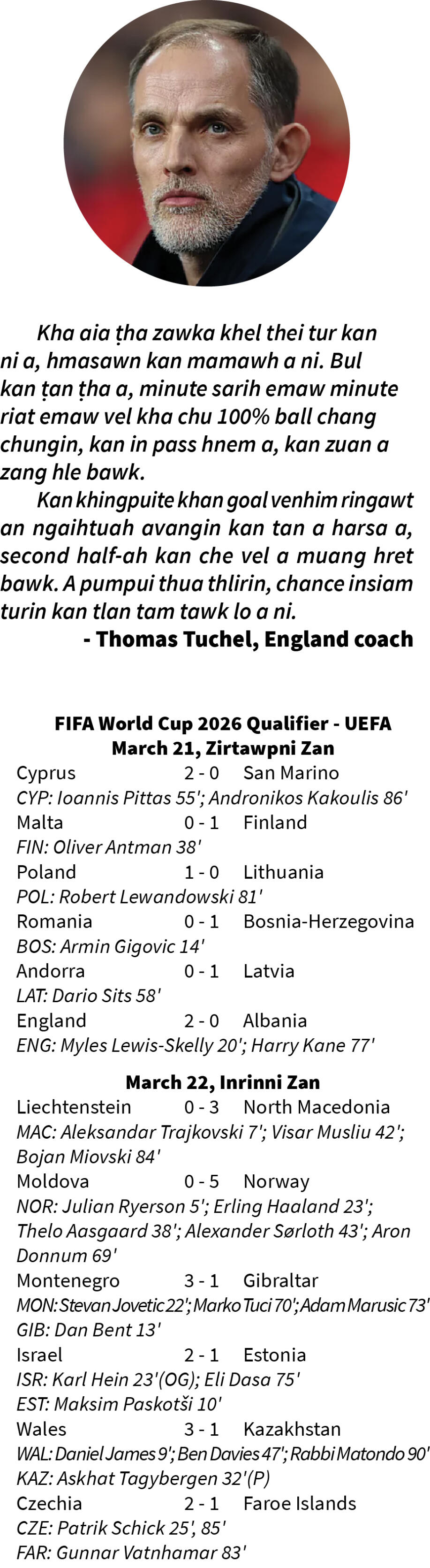 Thomas Tuchel-a enkawlna hnuaia an match hmasa berah England an chak nghal a, Zirtawpni zan khan World Cup qualifier-ah an mikhual Albania chu 2-0 in an hneh.