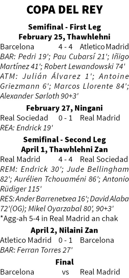Real Madrid-in Copa del Rey final an luh laia luh loh bik Barcelona-in an duh lo - Nilaini zan khan Spanish Cup semifinal second leg-ah Atlético Madrid chu 1-0 in an hneh a, inkhel hmasa nena belhkhawmin 5-4 in an chak.
