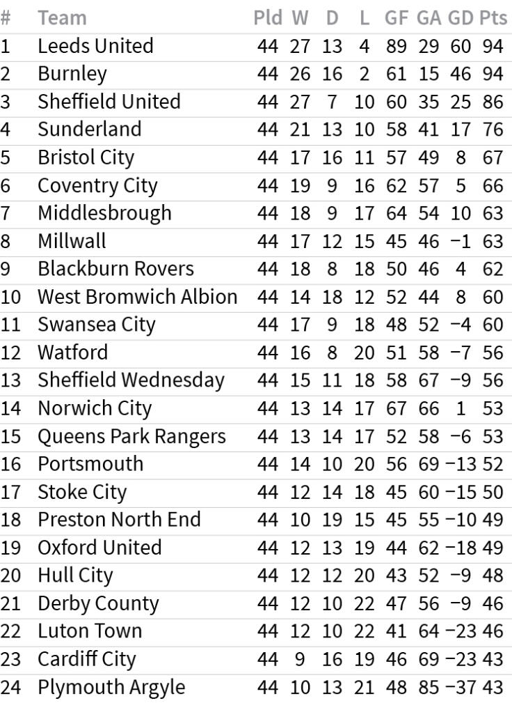 April 21, Thawhṭanni zanah Leeds United leh Burnley ten an khingpui ve ve an hneh a, season tharah Premier League an khel dawn tih a chiang ta - club pahnih hian match 44 khelh aṭangin point 94 ve ve an hmu a, pahnihna aia hniam an ni thei tawh lo.