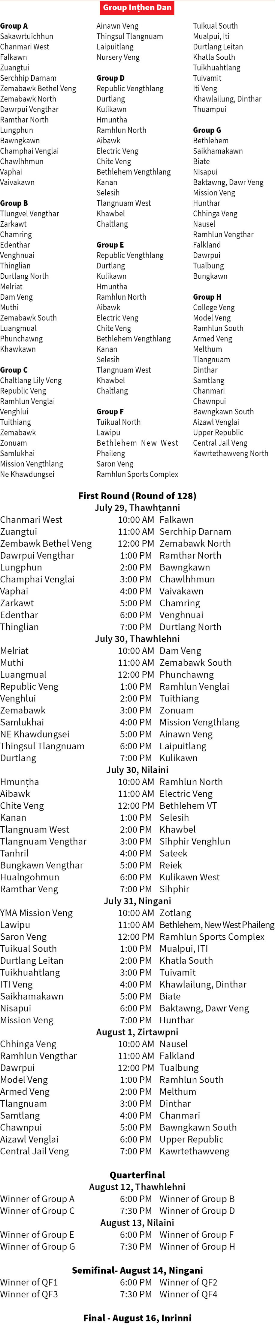 CYMA treasurer Roneihhanga'n fixture hi a tlangzarh a, inelna hi July 29, Thawhṭanni aṭangin R. Dengṭhuama Stadium, Mualpuiah khelh ṭan a ni ang. Inelna hi knockout hmanga khelh tur a ni a, August 16, Inrinniah champion zawnna hi neih tum a ni.