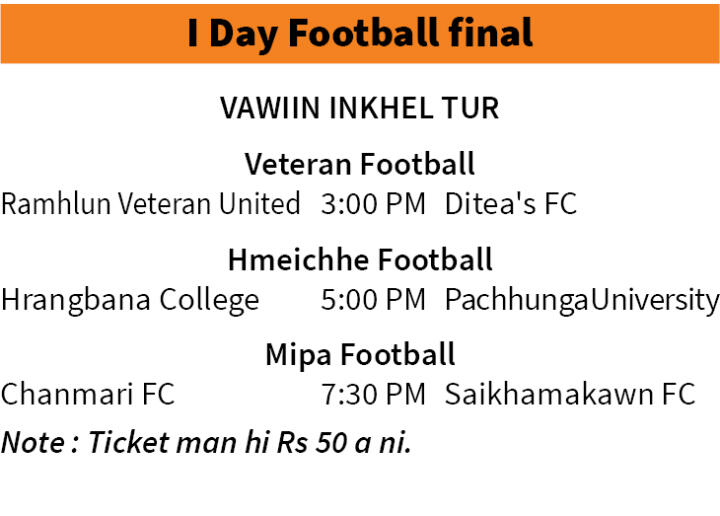 Mizoram Football Association hnuaia I Day Football hrang hrang pathum Veteran Football, Hmeichhe Football leh Mipa Football final chu vawiin hian RG Stadium-ah khelh vek a ni dawn.
